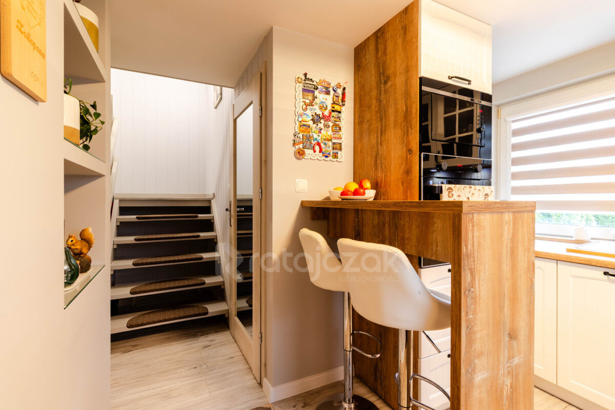 Na parterze znajduje się wiatrołap, korytarz, kuchnia, łazienka po remoncie oraz salon z kominkiem typu „koza”, który nadaje wnętrzu przyjemny klimat.