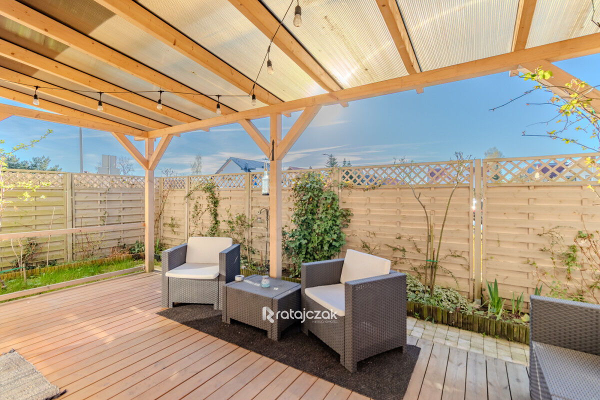 - Zadaszony taras o powierzchni 20 m2 (wliczony w metraż ogrodu), wyłożony naturalnymi drewnianymi deskami wraz z kompletem mebli ogrodowych.