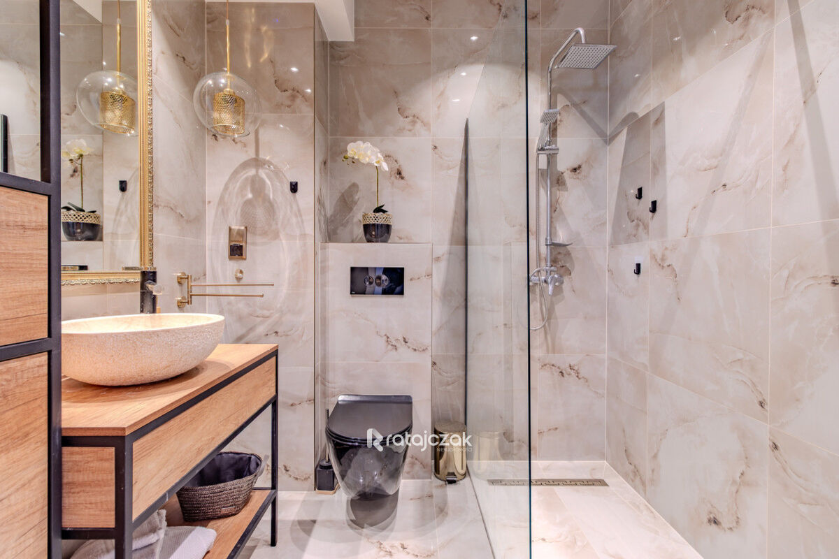- Łazienka - 4,12 m2. Wyposażona w prysznic z liniowym odpływem, toaletę i umywalkę z naturalnego kamienia.